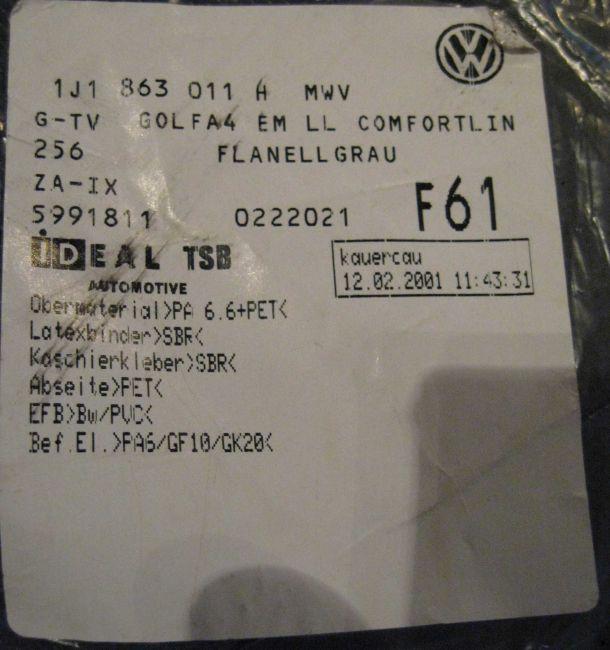 Märkning, orginalmattor Golf IV - till salu